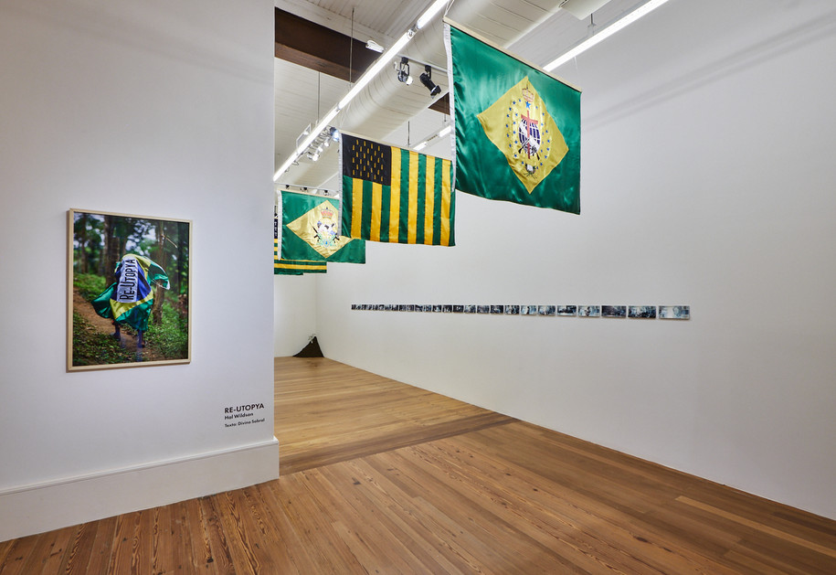 Na obra intitulada Re-Utopya para Pindorama (2022), Hal Wildson se apropria da estrutura visual de um estandarte representado em um cartaz comemorativo à abolição da escravatura, datado de 1888. Posicionado no centro do cartaz, o estandarte ostenta o Brasão Imperial legendado pela referência à Lei Áurea e integra a ilustração de um pacto social nunca efetivado no Brasil. Ao recriar o estandarte usando a técnica do bordado, ele enfatiza a qualidade fantasiosa da narrativa construída para minimizar os efeitos da escravidão, na tentativa de esconder a gravidade de suas marcas, e também simula um estandarte oficial, com estética nacionalista, que ostenta os nomes das filosofias ancestrais Teko Porã e Ubuntu escritos abaixo da bandeira Re-Utopya.