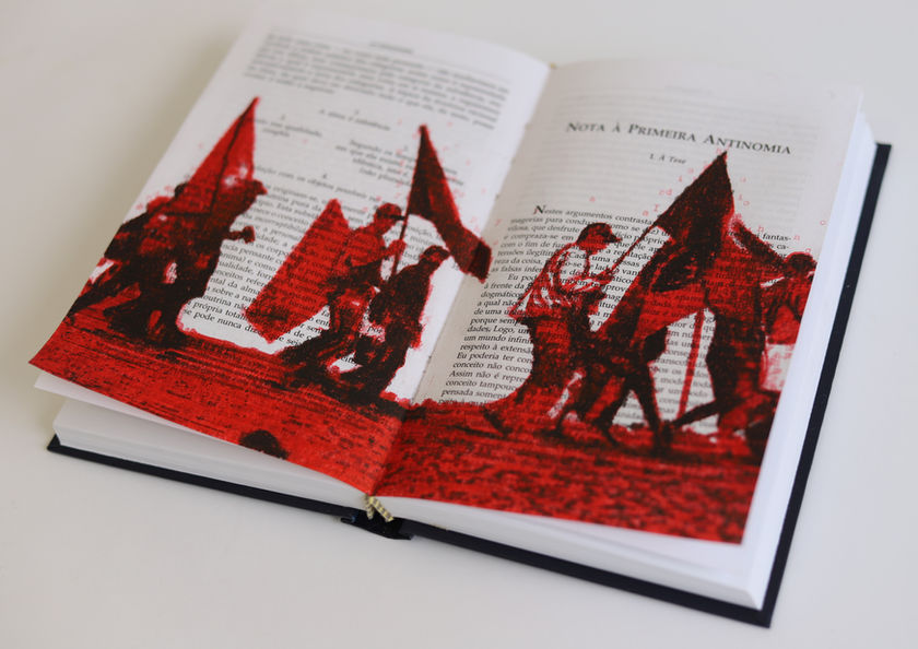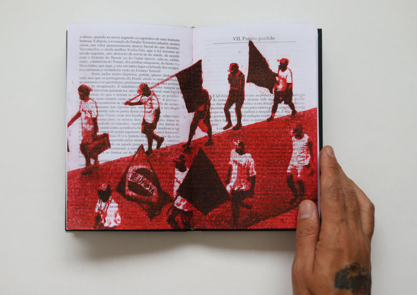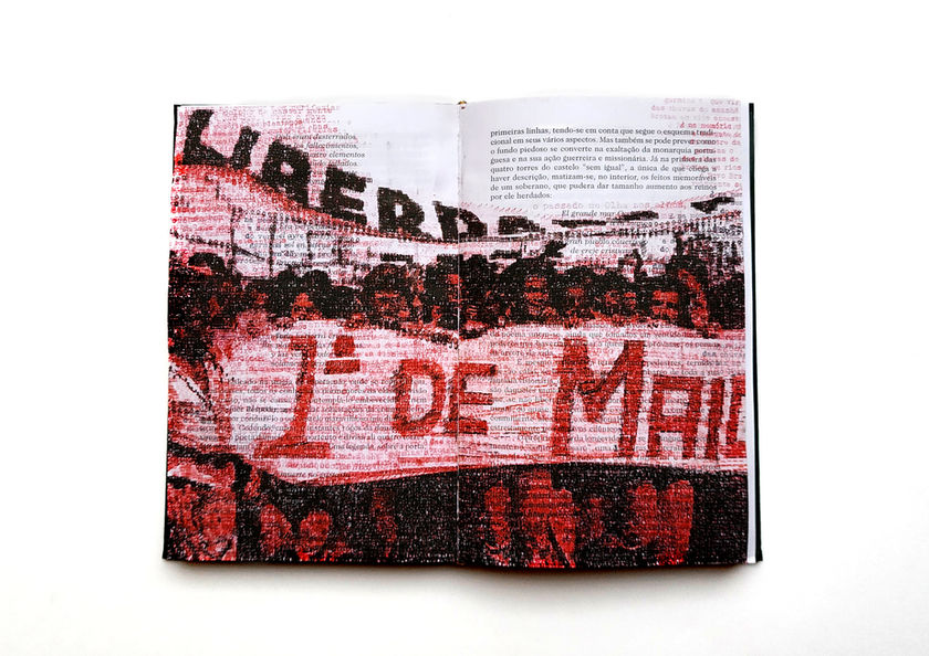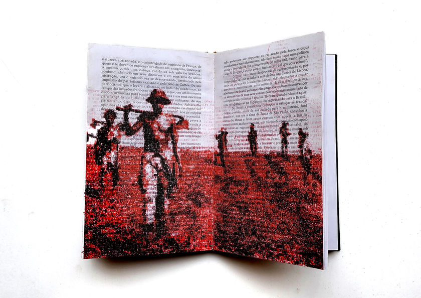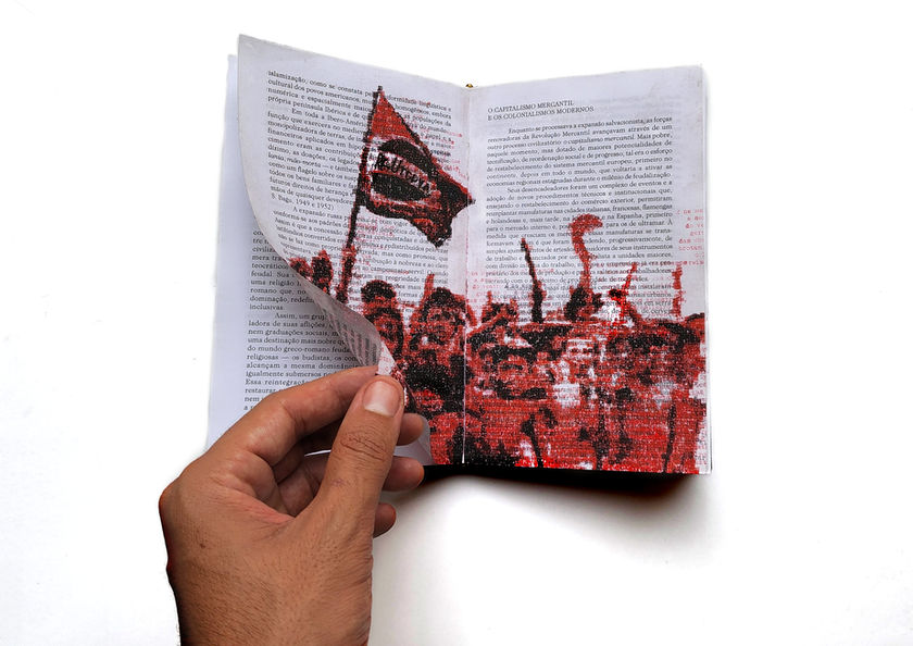 Na obra que inaugura a série : Utopia original, o artista propõe uma visão crítica sobre a ideia de um país que vive na mitologia do “país do futuro” mas que se esquece de tratar questões e problemas do passado. Utilizando técnicas de arquivamento e documentação escrita ( xerox, carimbo e máquina de escrever) o artista cria 384 documentos que juntos formam a imagem. As partes são criadas sobre xerox de partes do livro “O povo Brasileiro” Darcy ribeiro, buscando refletir sobre nossa visão como povo e sobre como a ideia de futuro parece sempre inalcançável. Através do conceito de Utopia, sua etimologia (Lugar nenhum) e a ideia de um país em construção o artista se apropria de diversas imagens históricas de manifestações populares no Brasil e cria uma nova imagem, uma Utopia Reinventada a partir de lutas sociais e protestos públicos.